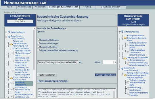 Mit Hilfe dieser Anwendung kann der Nutzer auf der Grundlage eines zentralen Leistungskataloges unter Angabe von Voreinstellungen zum LAK-Verfahren sowie durch liegenschaftsspezifische Vorauswahl von Abwasserobjekten und Mengen erforderliche Leistungspositionen bedarfsgerecht zusammenstellen. Die zusammengestellten Leistungen werden als MS-Word-Dateien für die Honoraranfrage und die zugehörigen Leistungsbeschreibungen ausgegeben. Die Projektdaten zur Honoraranfrage können durch den Nutzer lokal gespeichert werden und können für die erneute Bearbeitung wieder geladen werden.