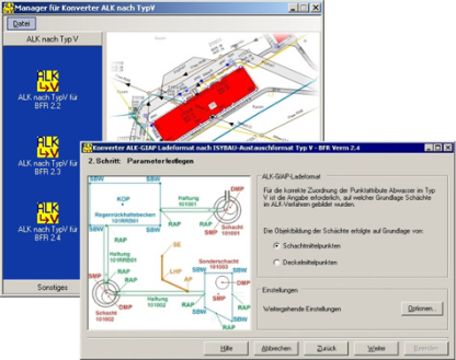 Der Konverter „ALK nach Typ V“ überführt Daten der Folie 850 bis einschließlich BFR Verm Version 2.4 aus einem ALK-GIAP Ladeformat in das ISYBAU-Austauschformat Typ V.