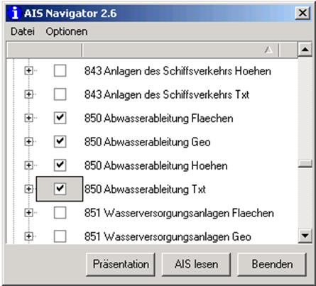 Grundsätzlich ist es für die Darstellung von Abwasserobjekten im AS Kanal erforderlich, dass die korrekten Fachauswahlen eingestellt sind, die bestimmen, welcher Teil des Datenbestandes im AIS dargestellt werden soll. Hierzu kann der AIS Navigator verwendet werden, der über die Schaltfläche oder den Menüpunkt des AS Bestand aufgerufen werden kann (AIS-Hauptmenü->AS Bestand->). Im AIS Navigator sind dann alle Fachauswahlen für die Folie 850 auszuwählen und über die Schaltfläche „Präsentation“ des Navigators im AIS zu präsentieren.